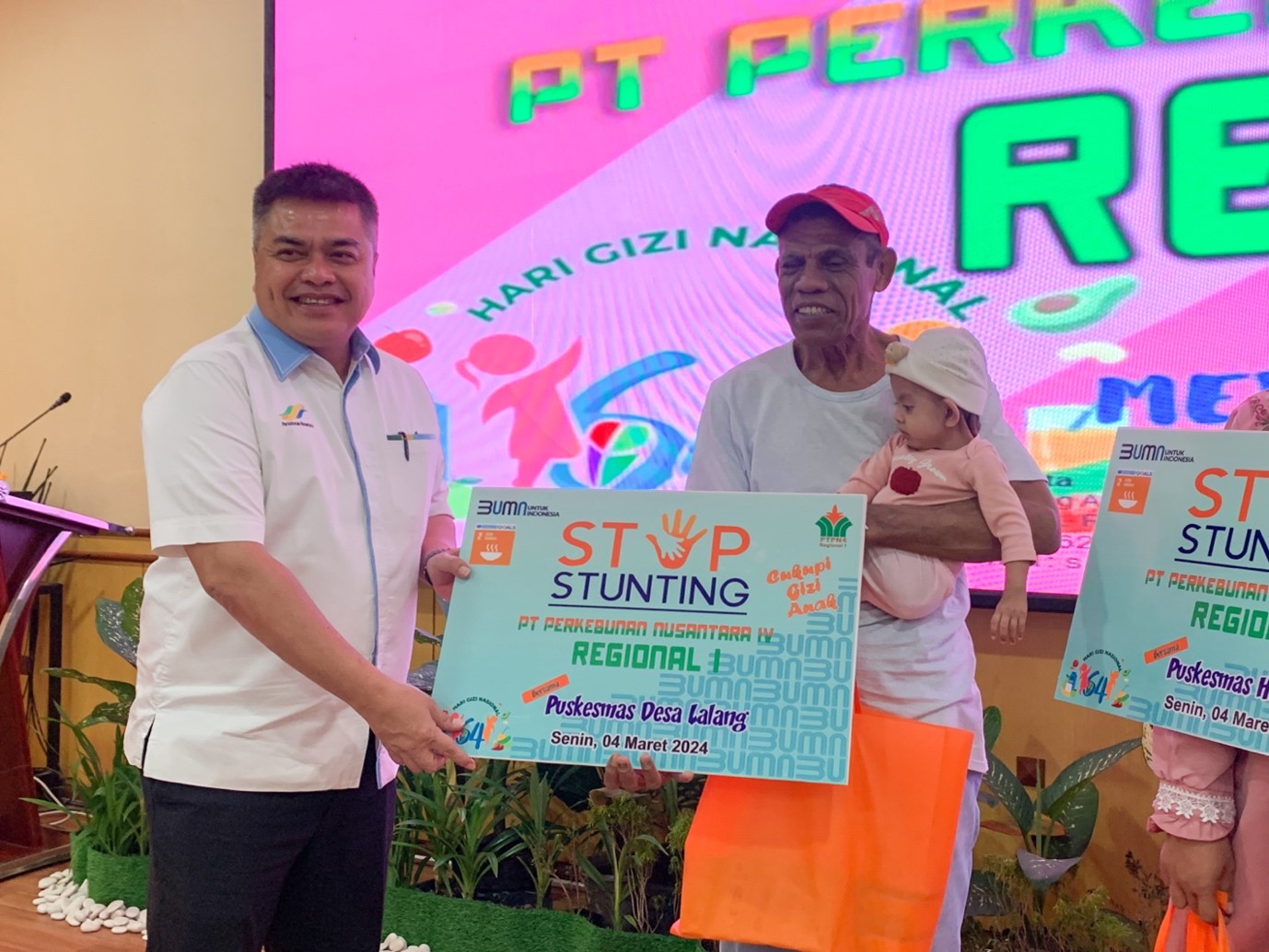 Penyerahan program pengentasan stunting di Sumut tahun 2024 melalui program tanggung jawab sosial perusahaan telah diberikan kepada 52 anak terdampak stunting di sekitar wilayah kebun/unit di PTPN IV Regional I.
