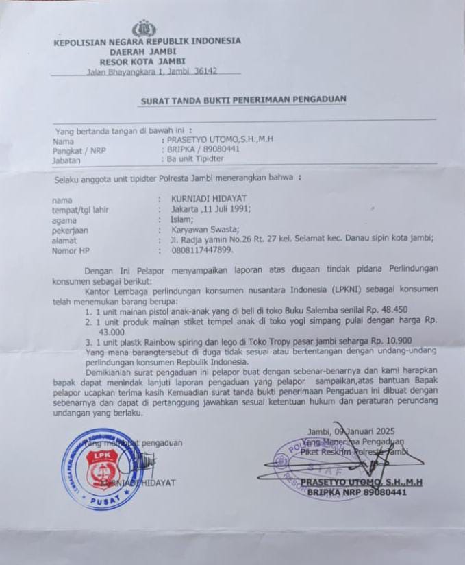 AR, didampingi oleh LPKNI, telah melaporkan temuan ini ke Polresta Jambi. Laporan tersebut mencakup dugaan penggunaan Standar Nasional Indonesia (SNI) palsu, tidak adanya buku panduan berbahasa Indonesia, serta ketidaksesuaian isi kemasan dengan produk. Hal ini dinilai melanggar Undang-Undang Perlindungan Konsumen.